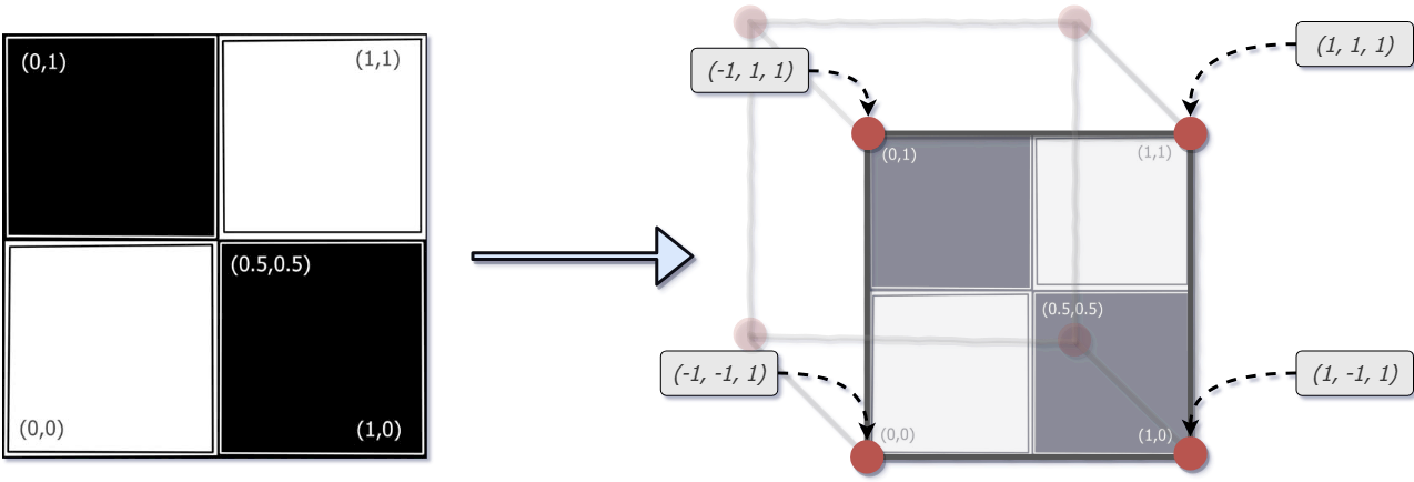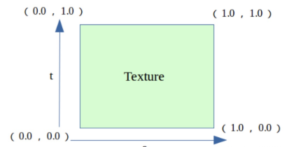 纹理的2D坐标系如下图所示,其中(0,0)在左下角和(1,1)在右上角。因为我们已经使用了字母X、Y和Z作为我们的3D坐标系,我们将使用字母U和V来指代2D纹理坐标系,这就是UV映射名称的由来。