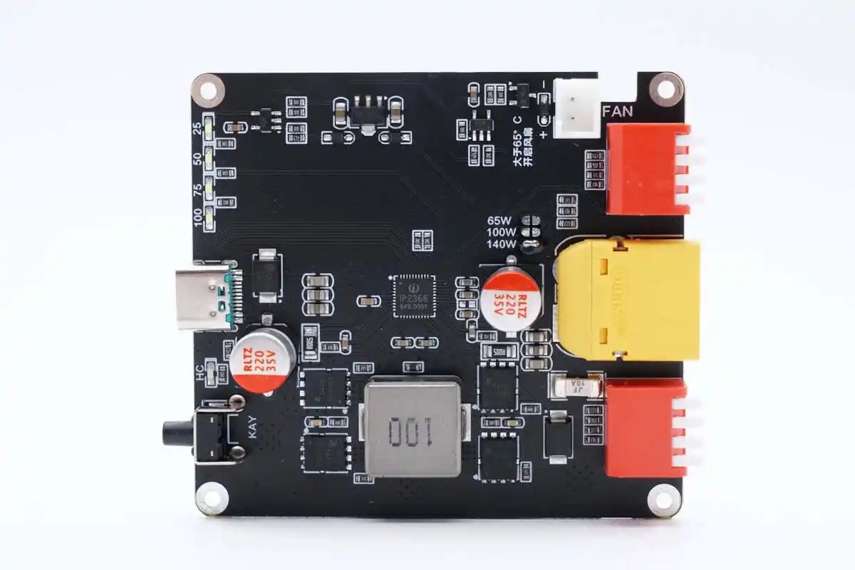 高功率充放电:支持140W充放电,最大充电电流5A,充电效率峰值96%。内置同步升降压转换器,支持2至6节锂电池串联,可驱动28V/5A输出,稳定支持大功率设备。