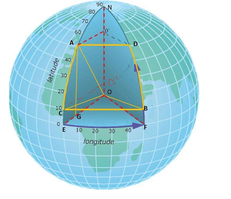 则C(lat1,long0),D(lat0,long1)。通过A、B、C、D四个点可以确定一个四边形平面。同一纬度相互平行,可知连接ACBD四点构成了一个等腰梯形。