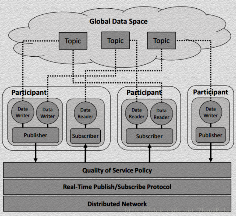 DDS构建了一个“全球数据空间”的概念。参与者无需知道彼此的存在,只需关心自己需要的数据。DDS采用以数据为中心的发布-订阅模型: