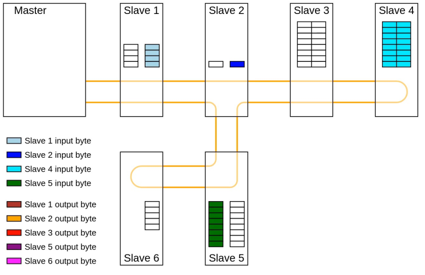 实时读写:每个从站像高速站台一样,在数据帧经过的瞬间(通常<1μs)读取自己的命令,并插入自己的状态数据,无需存储和转发整个帧。