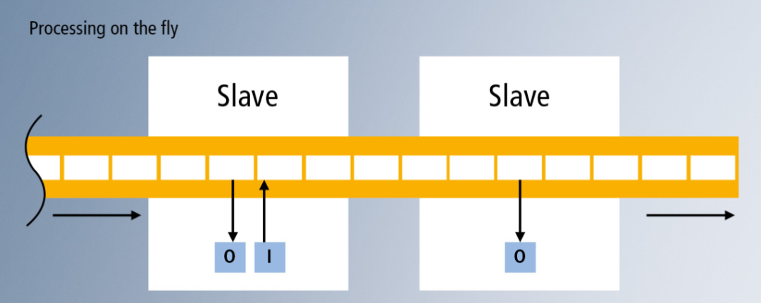 EtherCAT通信机制示意图,EtherCAT的“飞速帧”极大提升了效率