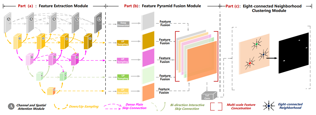 DNA-Net处理流程如上图所示,图像被送入密集嵌套交互模块(DNIM)的核心结构中,该模块用于提取多尺度的特征,并通过一个通道与空间注意力模块(CSAM)来增强这些特征,以解决不同层级特征间的语义差异。接着,这些被增强的特征图被送入特征金字塔融合模块(FPFM),在这里它们被统一尺寸并进行拼接,将浅层的空间细节与深层的高级信息相结合,生成一张的最终特征图。最后,利用八连通邻域聚类算法对这张图进行处理,通过聚类分析来确定出每个目标区域的中心点位置。接下来将分别介绍这三个部分。