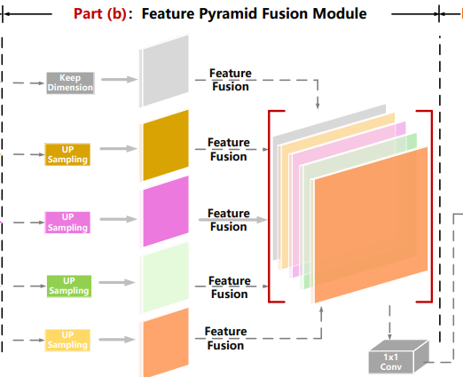 经过特征提取模块增强后的特征图会进入这一阶段进行融合,如上图所示,在FPFM模块中,来自不同尺度、经过CSAM增强的多层特征会被上采样到相同的尺寸。 然后包含丰富空间信息的浅层特征与含有高级别语义信息的深层特征进行拼接,生成一个信息更丰富的特征图。从上到下五个特征图输入的维度分别为(0,4)=(4,16,256,256),(1,3)=(4,32,128,128),(2,2)=(4,64,64,64),(3,1)=(4,128,32,32),(4,0)=(4,256,16,16)。FPFM模块代码体现为