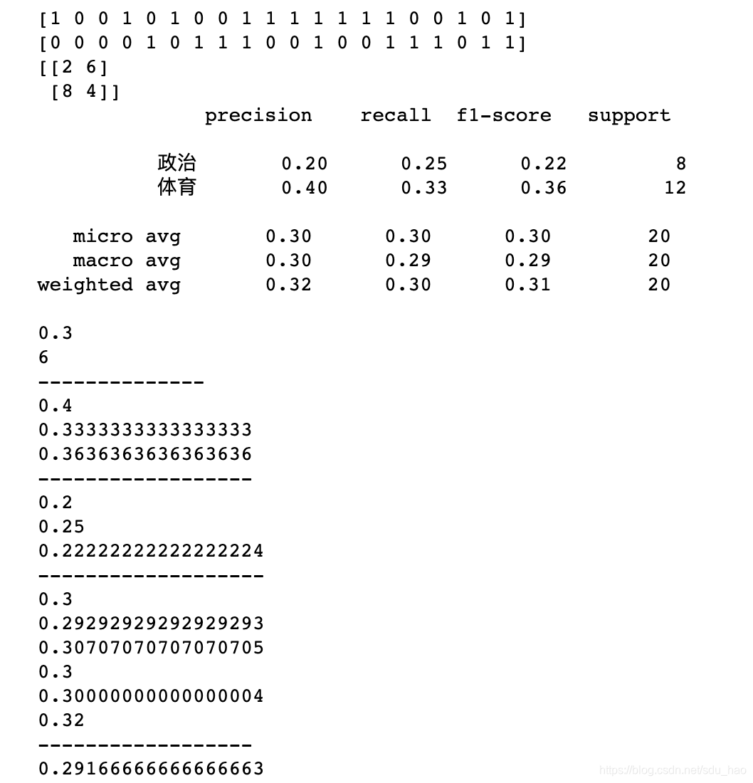 print(classification_report(Y_test1, Y_pred1,target_names=["政治","体育"],digits=2))#假设标签0代表政治、标签1代表体育 digits可以设置小数点后保留的位数 默认是2