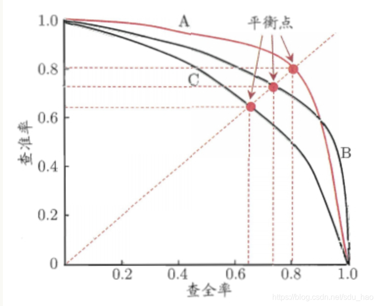 在上图中,我们发现, A 完全包住了C, 着意味着A 的Precision 与 Recall 都高于C, A优于C。 而对比 A,B, 二者存在交叉的情况,此时采用曲线下面积大小衡量性能,面积越大,性能越好,此处的A优于B。