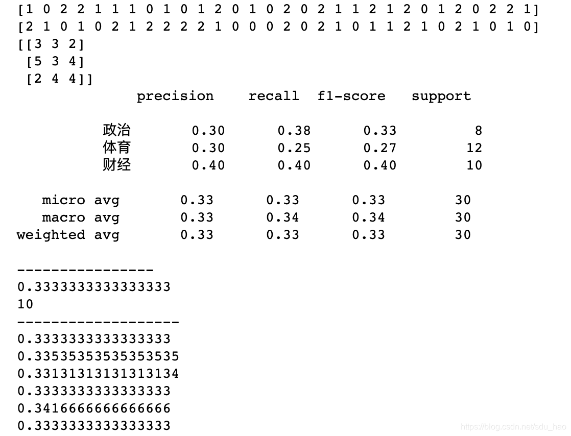 print(classification_report(Y_test2, Y_pred2,target_names=["政治","体育","财经"],digits=2))#假设标签0代表政治、标签1代表体育、标签2代表财经 digits可以设置小数点后保留的位数 默认是2