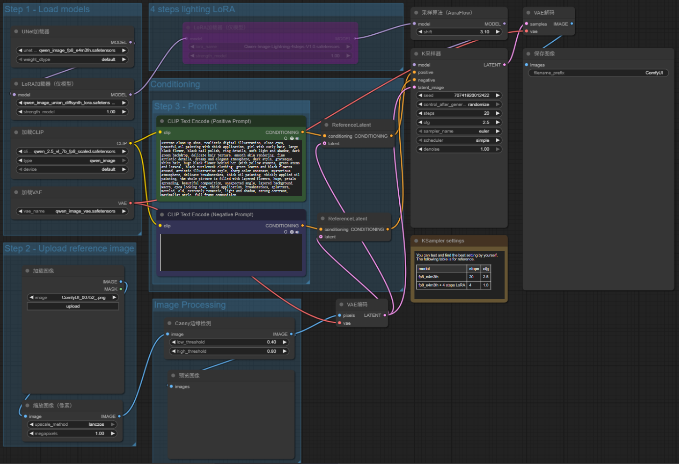 我们对该工作流进行梳理,可以获取如下工作流。可以看到,Qwen Image InstantX ControlNet模型的应用与1.5/XL等常规大模型的controlnet应用方式基本一致,在基础工作流的基础上,增加了controlnet应用节点,controlnet模型选择“Qwen Image InstantX ControlNet”。