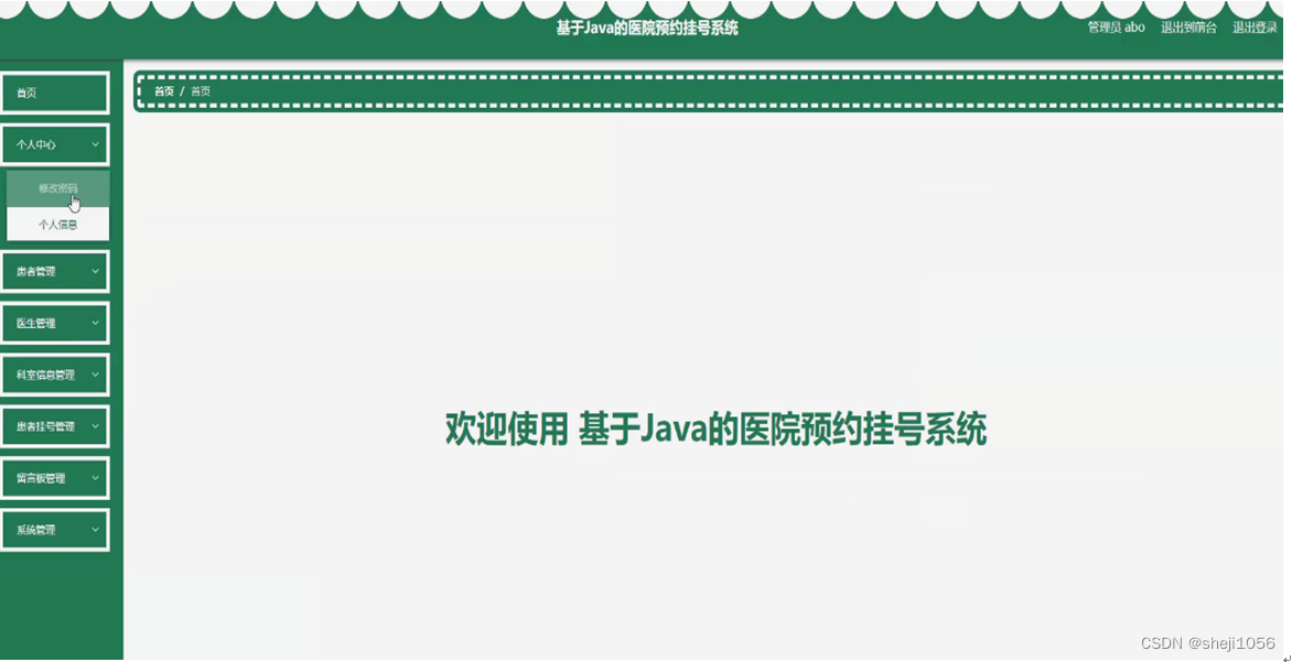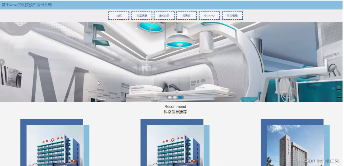 医院预约挂号系统,在网站首页可以查看首页、科室信息、通知公告、留言板、个人中心、后台管理等内容,如图5-1所示。