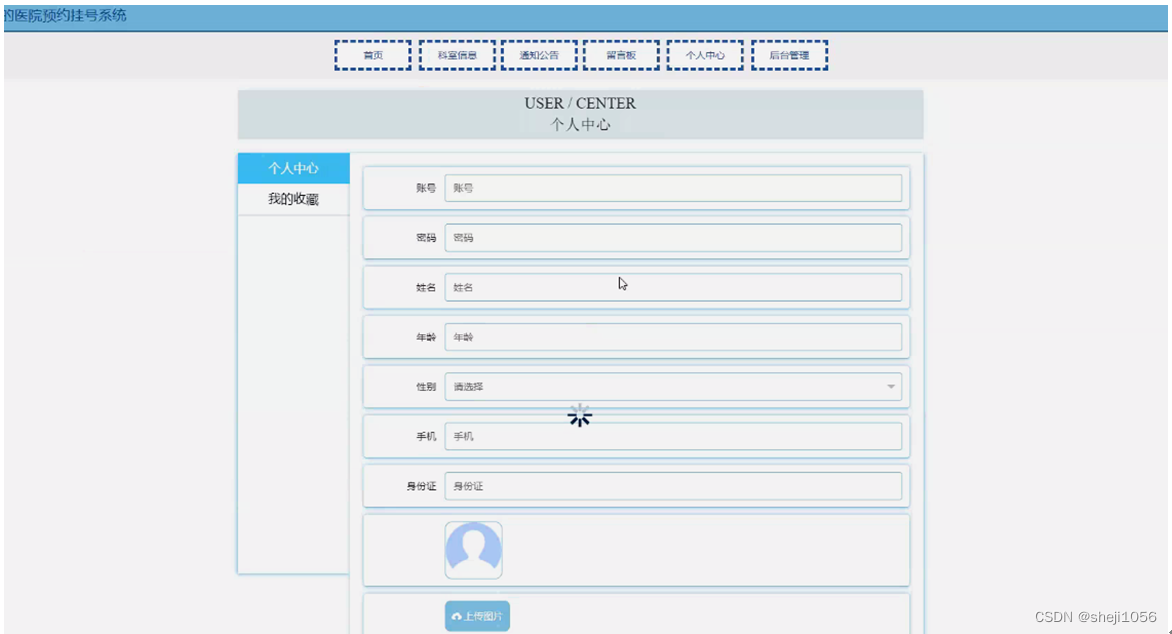 个人中心,在个人中心页面通过填写账号、密码、姓名、年龄、性别、手机、身份证、上传图片等信息进行更新信息,还可以根据需要对我的收藏进行相对应操作,如图5-5所示。