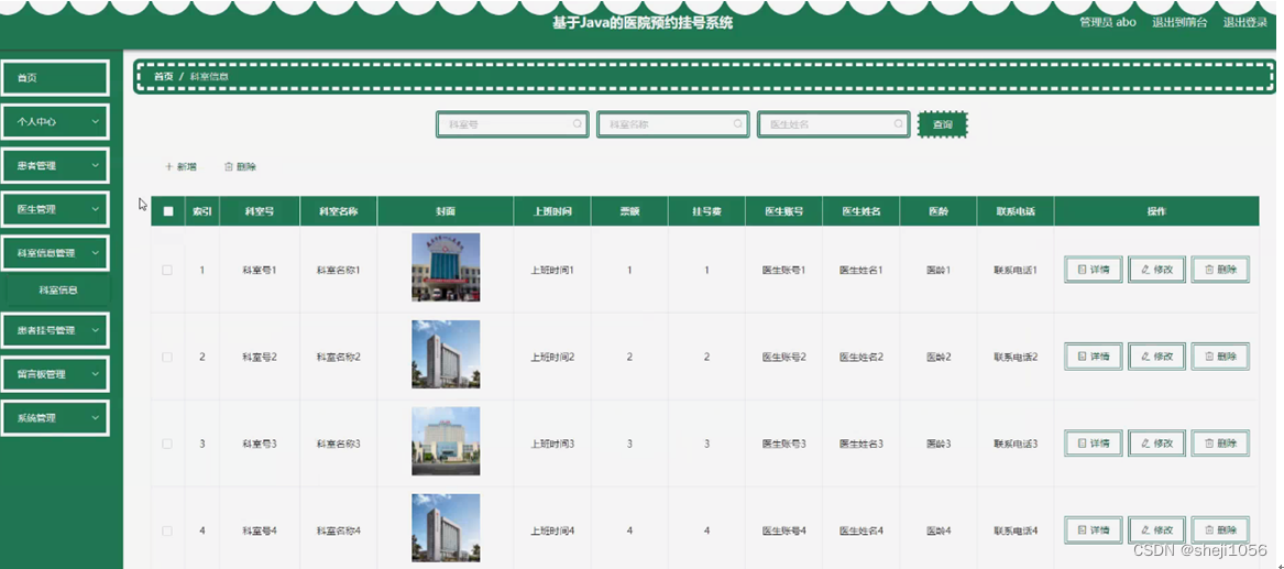 科室信息管理,在科室信息管理页面可以对科室号、科室名称、封面、上班时间、票额、挂号费、医生账号、医生姓名、医龄、联系电话等进行查看、修改或删除、新增等操作,如图5-10所示。