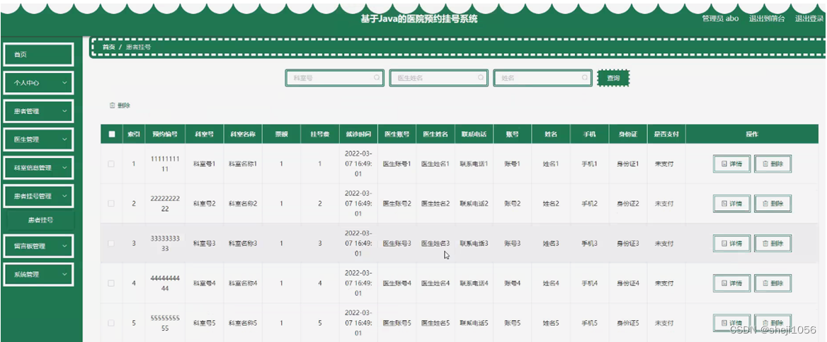 在患者挂号管理页面,管理员可以对预约编号、科室号、科室名称、票额、挂号费、就诊时间、医生账号、医生姓名、联系电话、账号、姓名、手机、身份证、是否支付等信息进行详情、删除等操作,如图5-11所示。