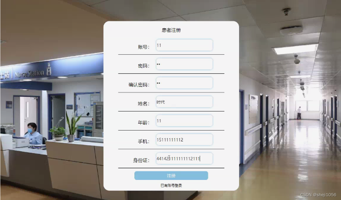患者如果需要在前台进行预约等操作,则需要进行注册和登录。点击患者注册,通过输入账号、密码、确认密码、姓名、年龄、手机、身份证等信息进行注册;点击登录,输入账号和密码进行登录,用户注册及登录页面如图5-2所示。