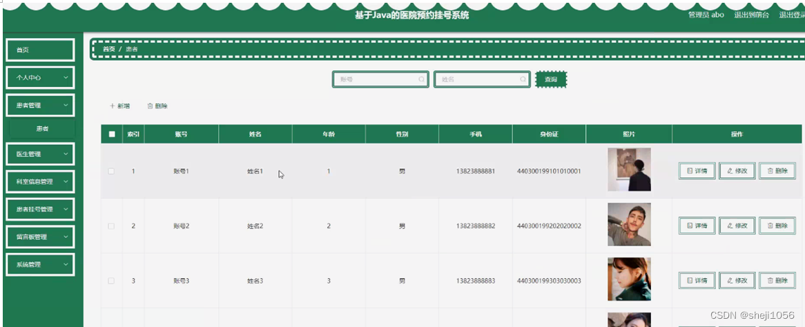 在患者管理页面,管理员可以对索引、账号、姓名、年龄、性别、手机、身份证、照片等进行详情、修改、删除或新增等操作,如图5-8所示。