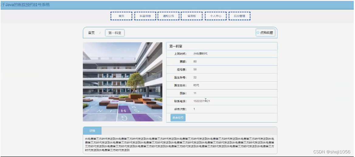 点击科室信息,患者可以查看科室号、科室名称、封面、上班时间、票额、挂号费、医生账号、医生姓名、医龄、联系电话、点击次数、详情等内容,并进行收藏、患者挂号等操作,科室信息页面如如图5-3所示。