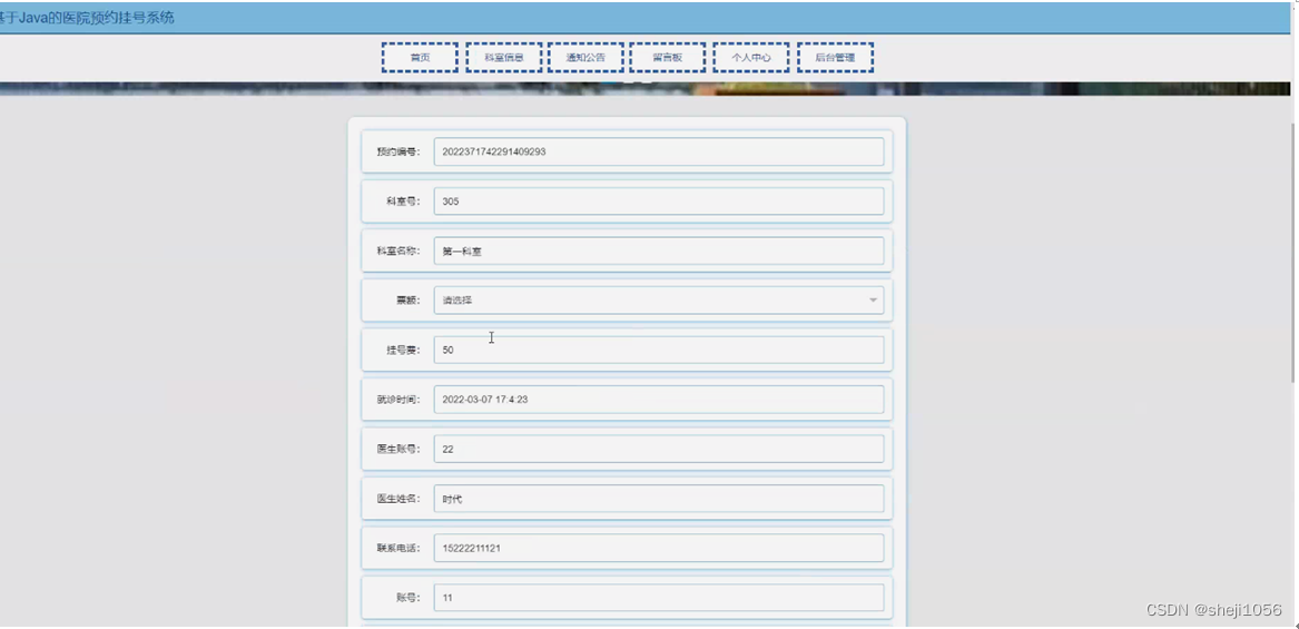 在科室信息页面,点击患者挂号,通过输入预约编号、科室号、科室名称、票额、挂号费、就诊时间、医生账号、医生姓名、联系电话、账号、姓名、手机、身份证等内容,点击提交进行患者预约,如图5-4所示。