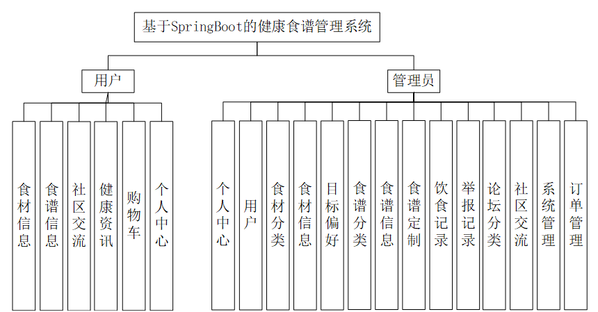 随着人们健康意识的提高,对饮食的管理和规划变得越来越重要。而传统的饮食管理方式往往存在效率低下、不够个性化等问题。因此,开发一个健康食谱管理系统,能够帮助用户更方便地管理自己的饮食计划,提高饮食的科学性和合理性,具有重要的研究意义和应用价值。该系统不仅能够满足个人的健康管理需求,还可以为餐饮机构、健康咨询机构等提供有力的支持,具有广阔的市场前景和应用潜力。基于SpringBoot的健康食谱管理系统分为用户和管理员两部分。用户功能包括食材信息,食谱信息,社区交流,健康资讯,购物车,个人中心。管理员管理功能包括用户,食材分类,食材信息,目标偏好,食谱分类,食谱信息,食谱定制,饮食记录,举报记录,论坛分类,社区交流,系统管理,订单管理,个人中心。系统结构功能图如图4-1所示。