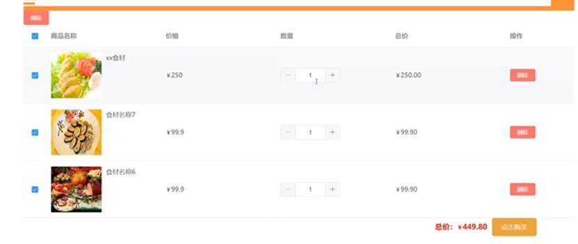 用户登录系统后点击购物车进入购物车页面,用户可以查看购物车食材信息,可以把不需要的食材从购物车移除,可以直接进行下单购买。