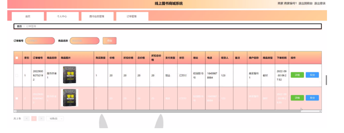 (4)商家,添加图书信息,对图书订单进行发货。
