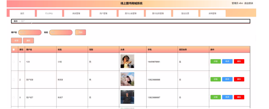 管理员点击用户管理。进入用户信息页面输入用户名、姓名进行查询,删除用户信息,并进行查看详情,修改和删除等操作。如图5-15所示: