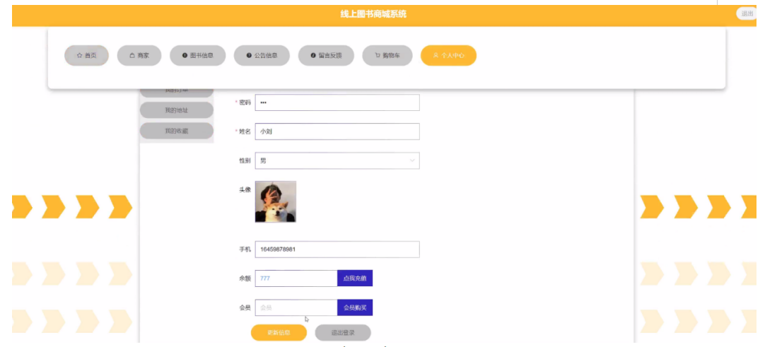 点击个人中心,在个人中心页面可以更新个人详细信息,还可以对我的订单、我的地址、我的收藏进行详细操作;如图5-6所示: