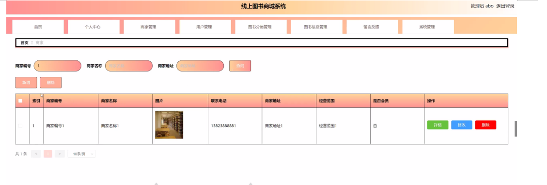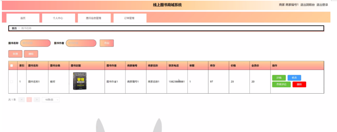 商家点击图书信息管理。进入图书信息页面输入图书名称、图书作者进行查询或新增、删除图书信息,并进行查看详情,修改和删除等操作。如图5-10所示: