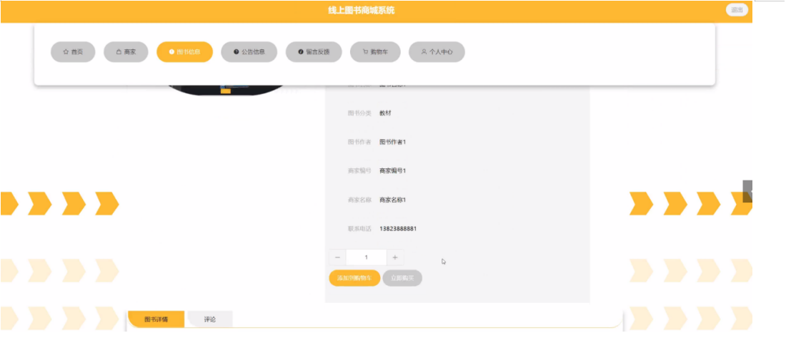 点击图书信息,用户可以查看图书名称、图书分类、图书封面、图书作者、商家编号、商家名称、联系电话、单限、库存、价格、会员价等信息,并进行添加到购物车、评论或者收藏等操作,如图5-4所示。