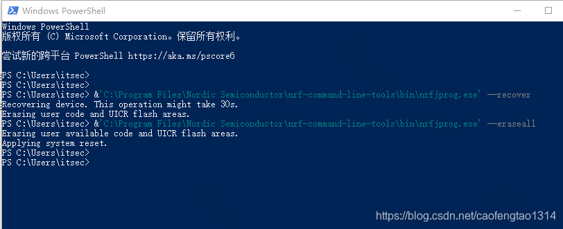 &'C:\Program Files\Nordic Semiconductor\nrf-command-line-tools\bin\nrfjprog.exe' --eraseall&'C:\Program Files\Nordic Semiconductor\nrf-command-line-tools\bin\nrfjprog.exe' --recover