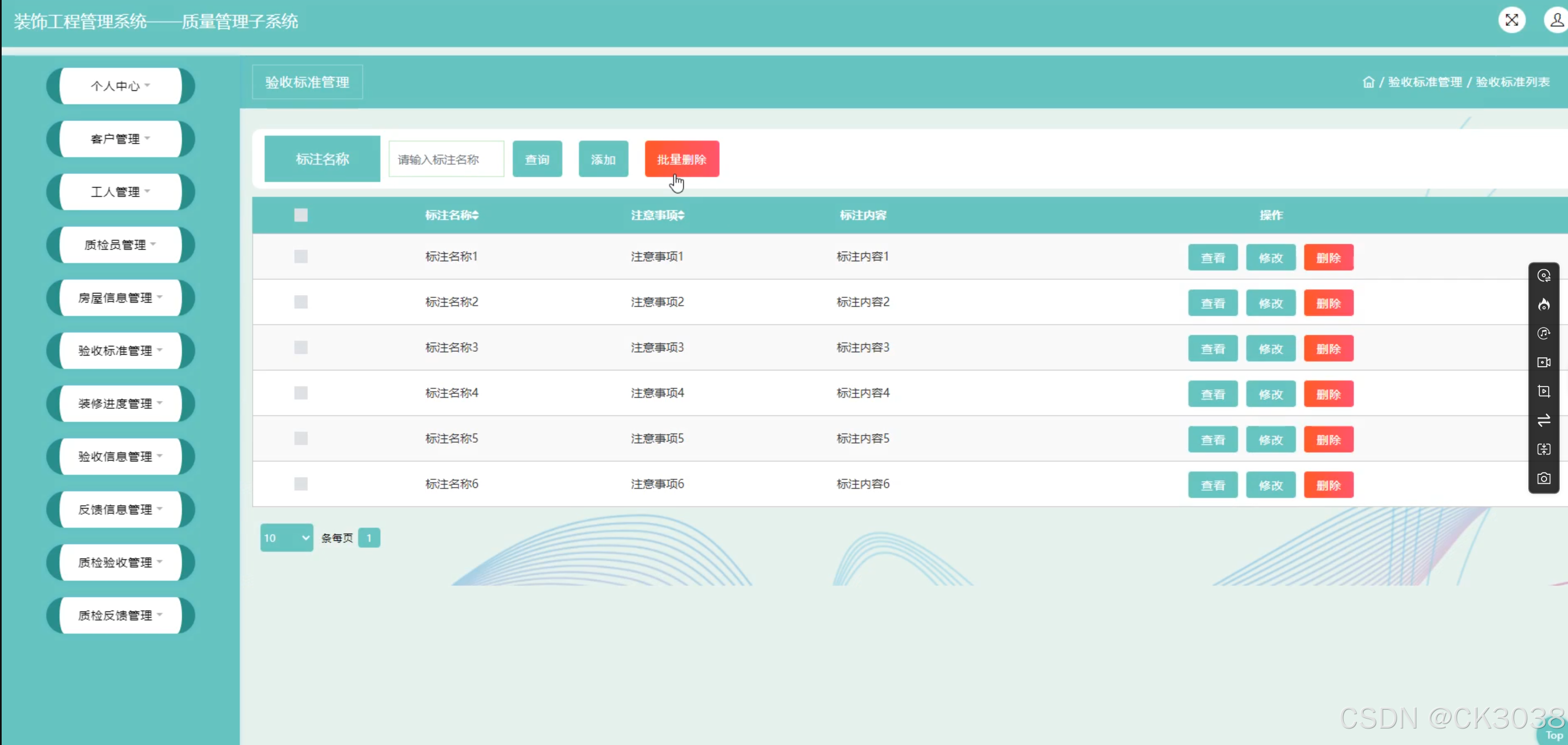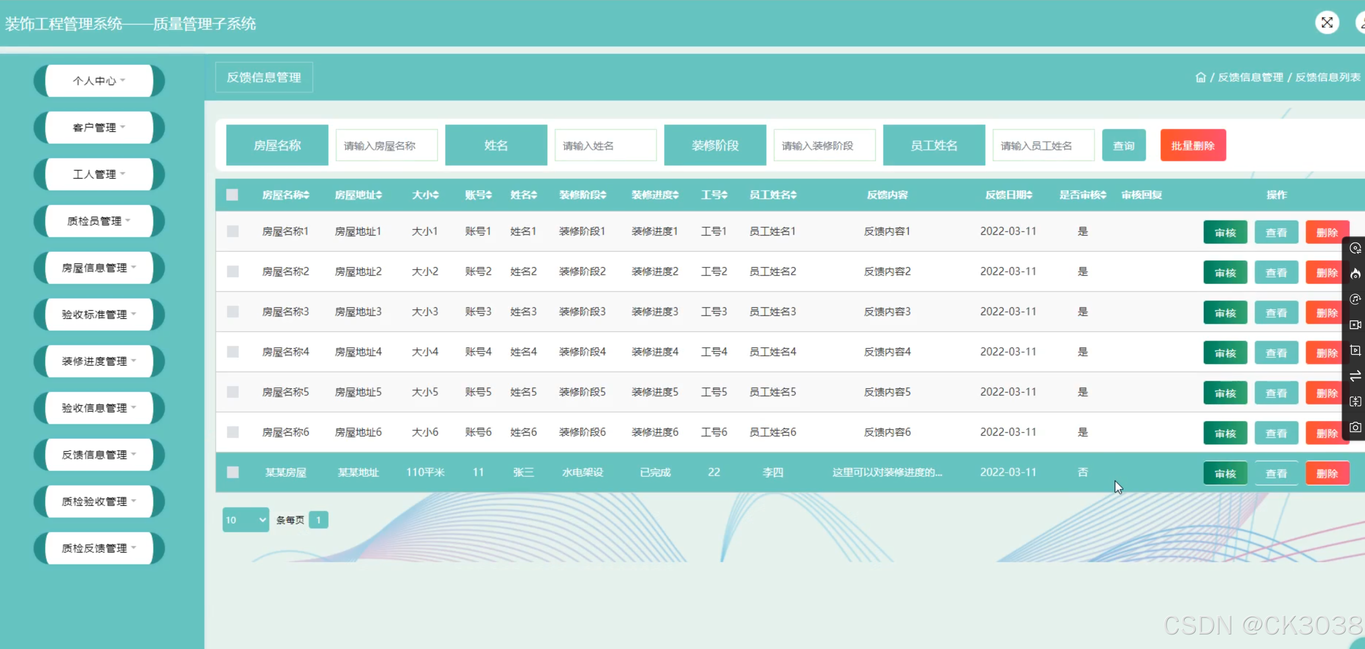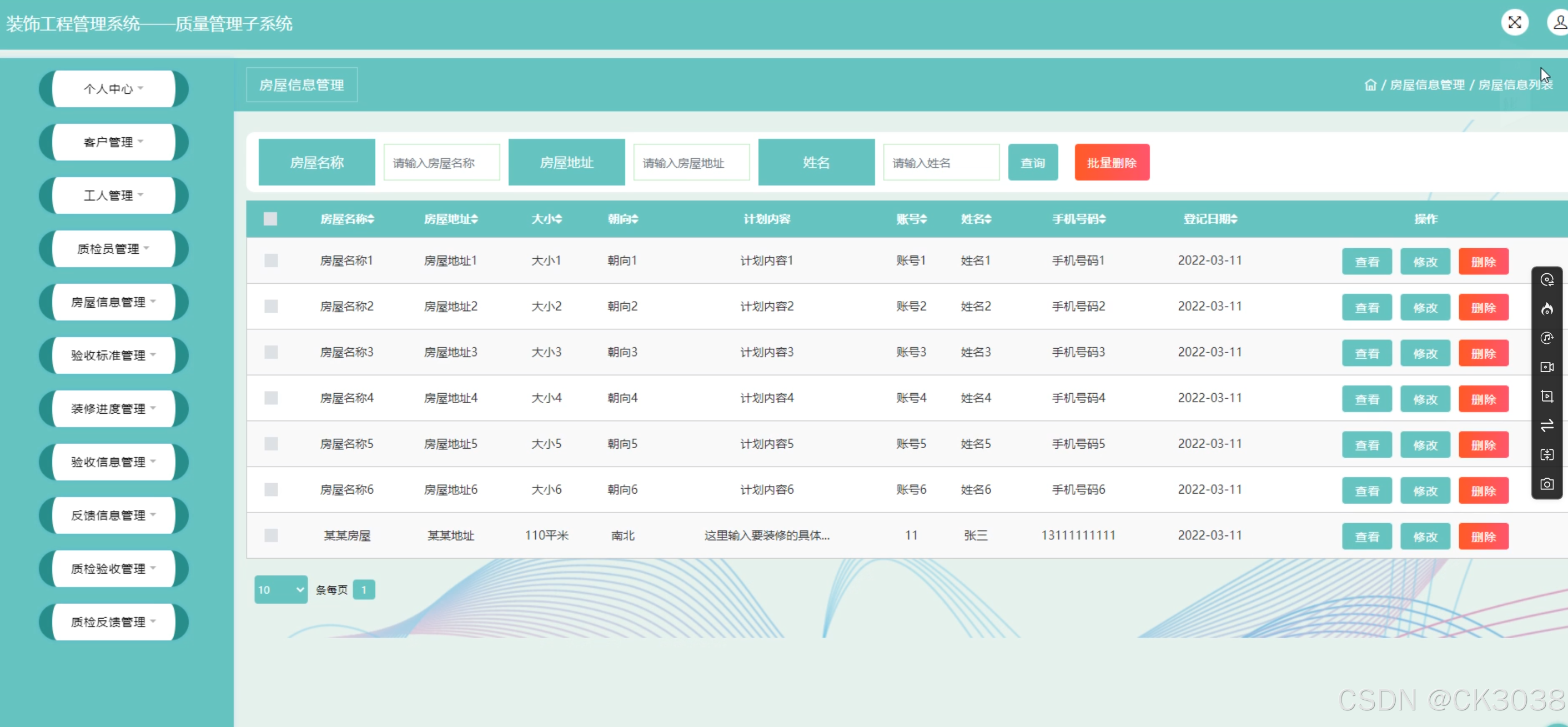 - 模块开发:涵盖工人管理、质检员监督、客户反馈、房屋信息管理、验收标准制定、装修进度跟踪、验收信息处理、反馈信息管理、质检验收流程、质检反馈机制以及任务分配等多个功能模块。