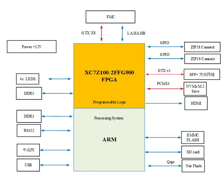 本板卡基于Xilinx公司的FPGA XC7Z100 FFG 9000 芯片, 该平台为设计和验证应用程序提供了一个完整的开发平台。该平台使设计师能够更加简单进行高性能的原型设计,并且通过FMC HPC扩展槽提供可扩展性和满足客户定制需求。