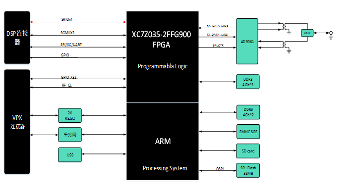 本板卡基于Xilinx公司的最新SoC架构(ARM+FPGA)的ZYNQ7035芯片和ADI公司高集成度的捷变射频收发器AD9361,实现频谱范围70MHz~6GHz,模拟带200KHz~56MHz的宽频收发系统。ZYNQ7035支持千兆以太网、UART等接口,存储设备采用16Gb容量的DDR3、32MB QSPI FLASH、8GB EMMC等。