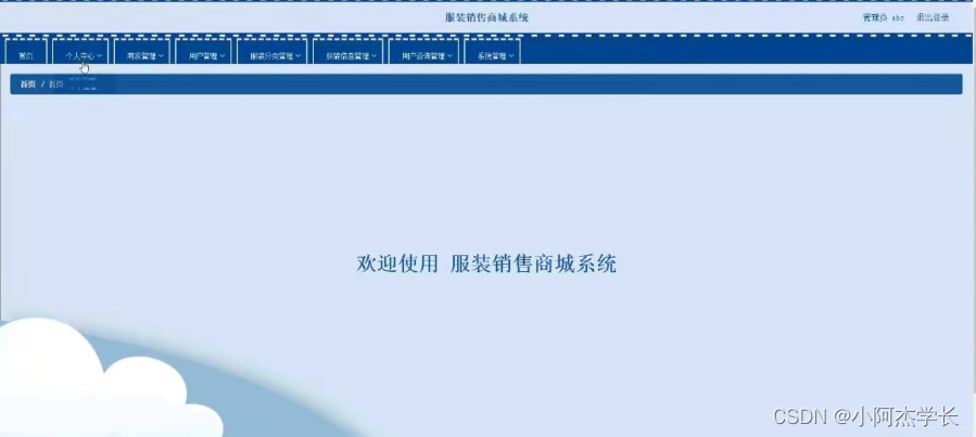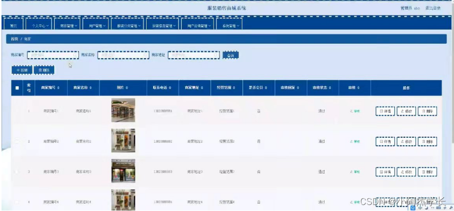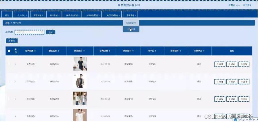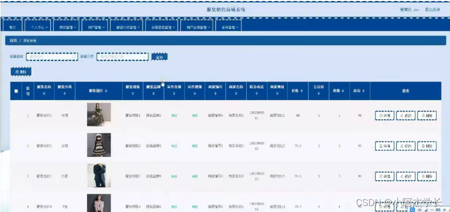 管理员登录进入系统可以查看首页,个人中心,商家管理,用户管理,服装分类管理,服装信息管理,用户咨询管理,系统管理等功能,并进行详细操作,如图5-7所示。