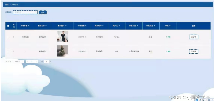 用户咨询管理;在用户咨询管理页面中可以查看索引,咨询标题,服装名称,服装图片,咨询日期,商家编号,用户名,审核回复,审核状态等内容,并进行详情操作;如图5-15所示。