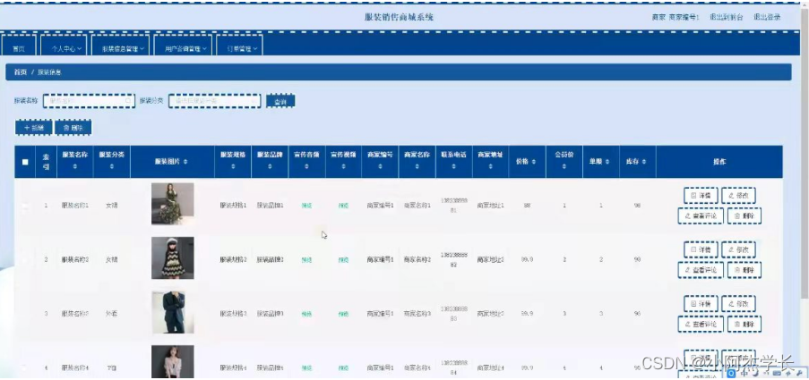 服装信息管理;在服装信息管理页面中可以查看索引,服装名称,服装分类,服装图片,服装规格,服装品牌,宣传音频,宣传视频,商家编号,商家名称,联系电话,商家地址,价格,会员价,单限,库存等内容,并进行详情,修改和删除操作;如图5-10所示。
