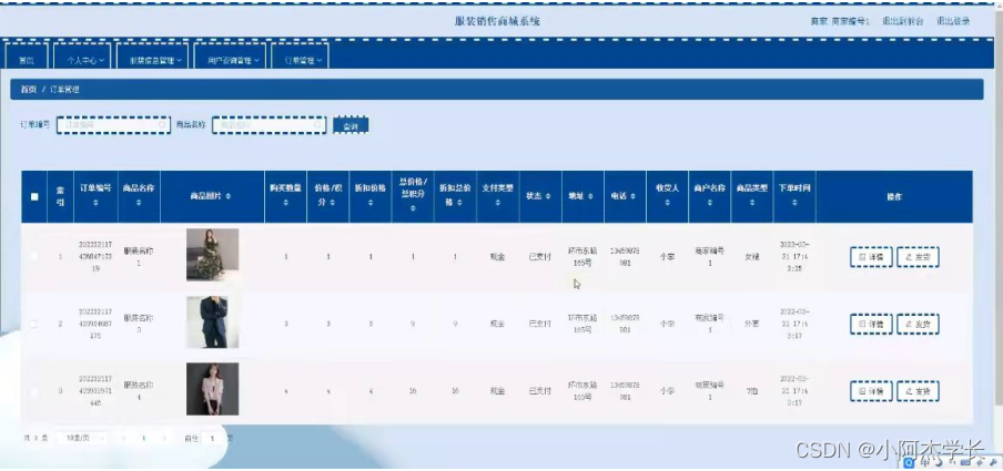 商家登录进入系统可以查看首页,个人中心,服装信息管理,用户咨询管理,订单管理等功能,并根据需要进行详细操作,如图5-13所示。