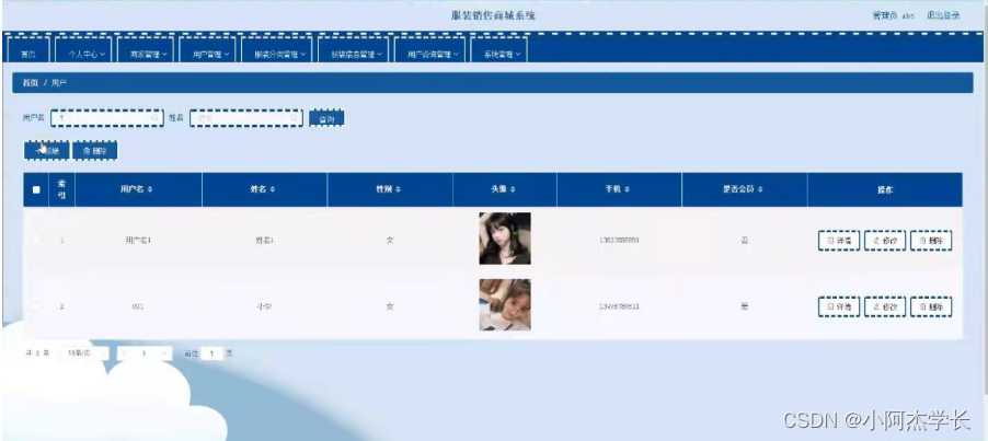 用户管理;在用户管理页面中可以对首页,用户名,姓名,性别,头像,手机,是否会员等内容进行详情,修改和删除操作,如图5-9所示。