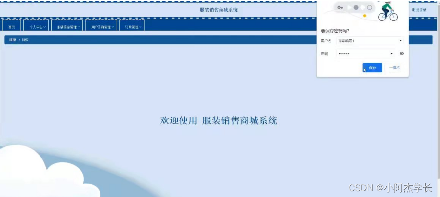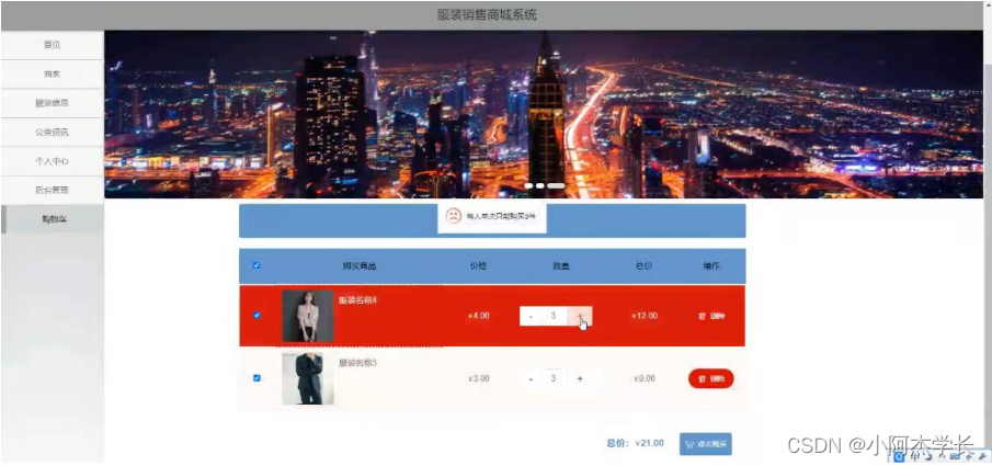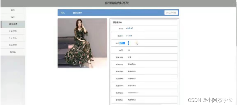 服装销售商城系统,在系统首页可以查看首页,商家,服装信息,公告资讯,个人中心,后台管理,购物车等内容,并进行详细操作;如图5-1所示。