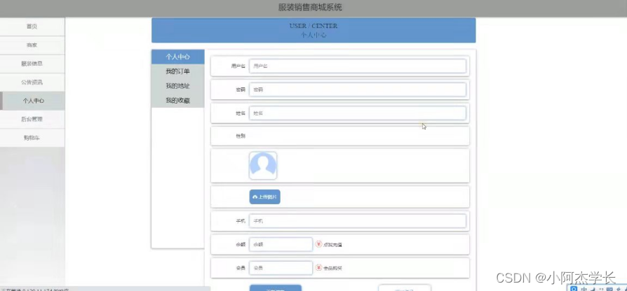 个人中心,在个人中心页面通过填写用户名,,密码,姓名,性别,手机号,上传图片,余额,会员等内容进行更新信息,还可以根据需要对我的订单,我的地址,我的收藏进行相对应操作,如图5-5所示。