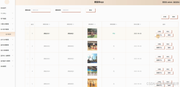 管理员点击技术教学管理。在技术教学页面输入课程名称和课程类型进行查询,新增或删除技术教学列表,并根据需要对技术教学详情信息进行查看详情,修改,查看评论或删除操作;如图5-10所示。