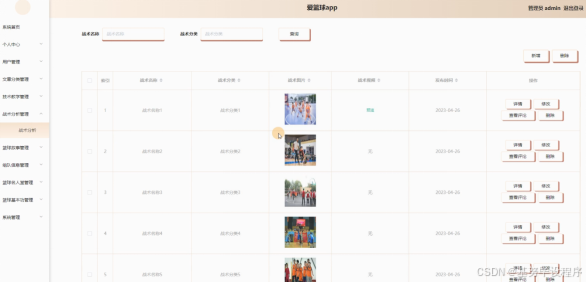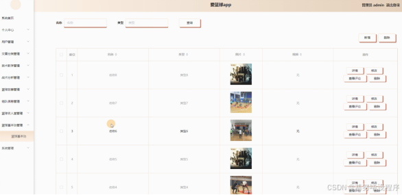 管理员点击篮球基本功管理。在篮球基本功页面输入名称和类型进行查询,新增或删除篮球基本功列表,并根据需要对篮球基本功详情信息进行查看详情,修改,查看评论或删除操作;如图5-15所示。