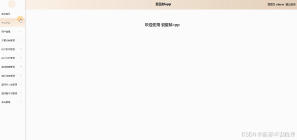 管理员登录进入APP可以查看个人中心、用户管理、文章分类管理、技术教学管理、战术分析管理、篮球故事管理、组队信息管理、篮球名人堂管理、篮球基本功管理、系统管理等功能进行详细操作,如图5-8所示。