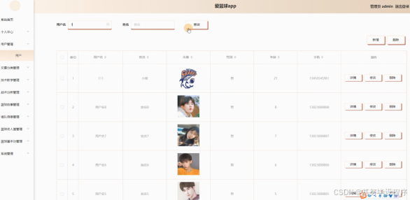 管理员点击用户管理。在用户页面输入用户名和姓名进行查询,新增或删除用户列表,并根据需要对用户详情信息进行查看详情,修改或删除操作;如图5-9所示。