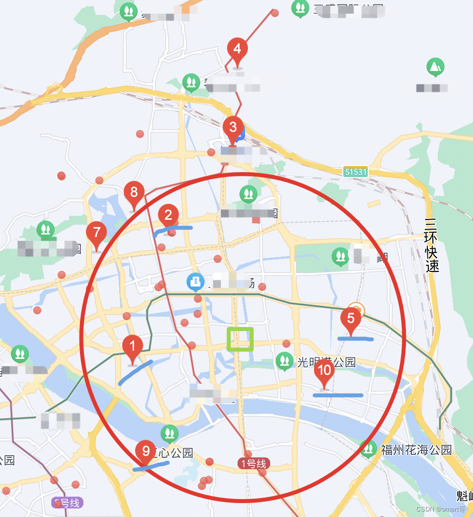 下图的绿色区域在固定半径(红圈)中搜索到了特定的几个目标位置:1、2、5、9、10。