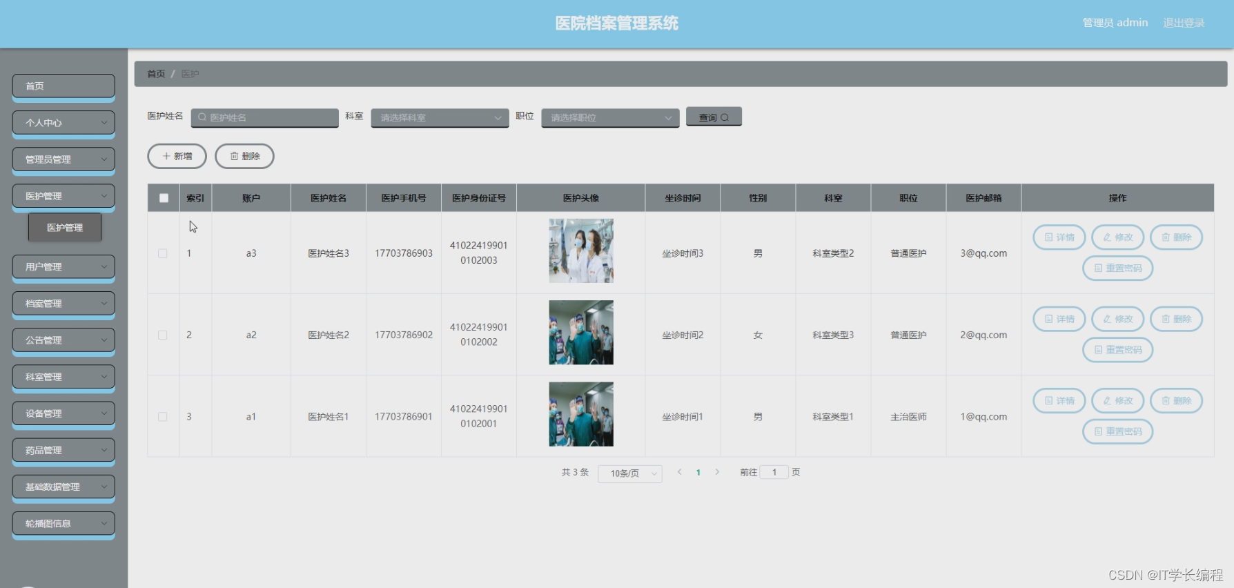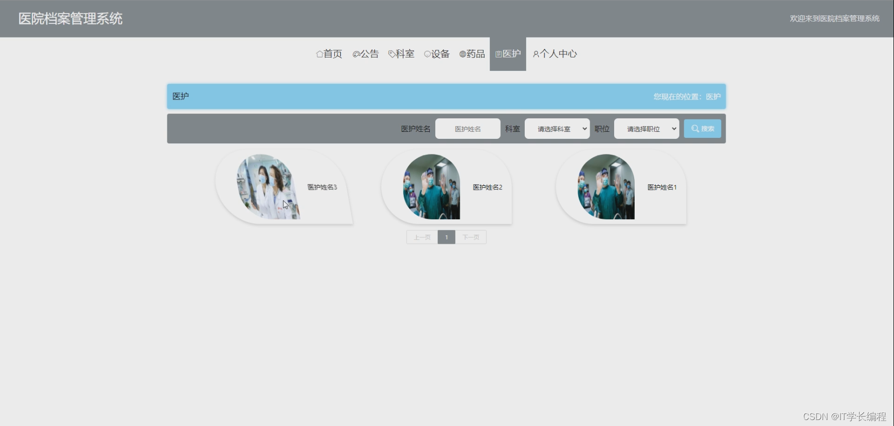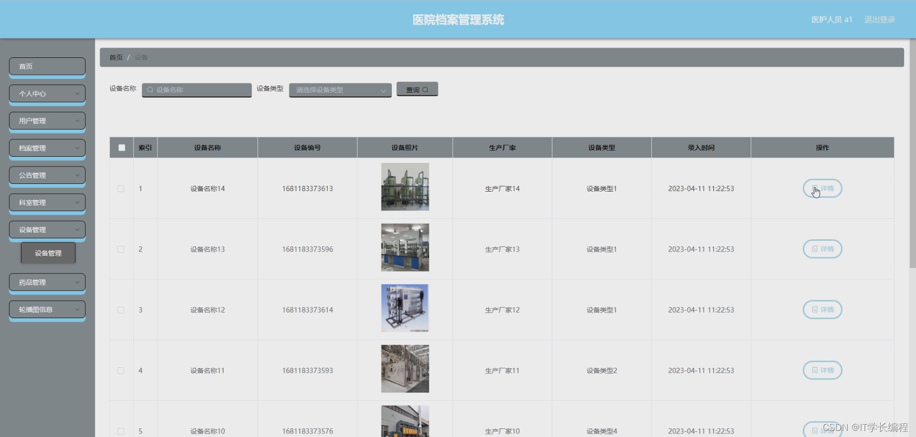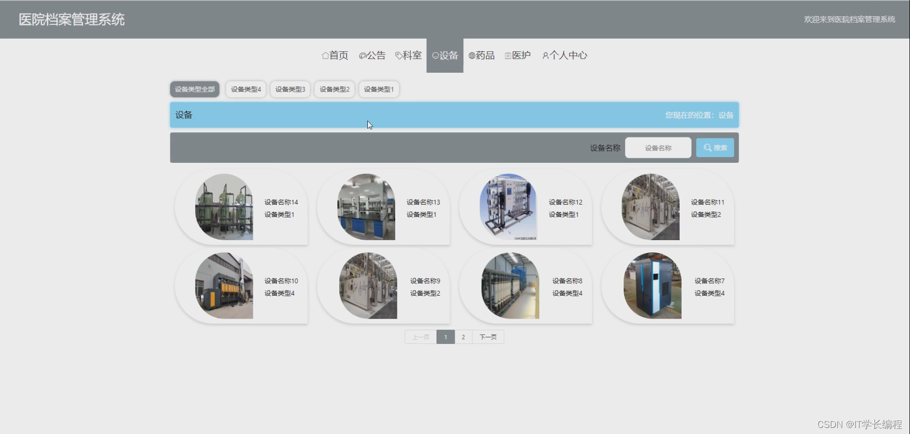 医护人员:注册登录、首页、个人中心(修改密码、个人信息)、用户管理、档案管理、公告管理、科室管理、设备管理、药品管理、轮播图管理。