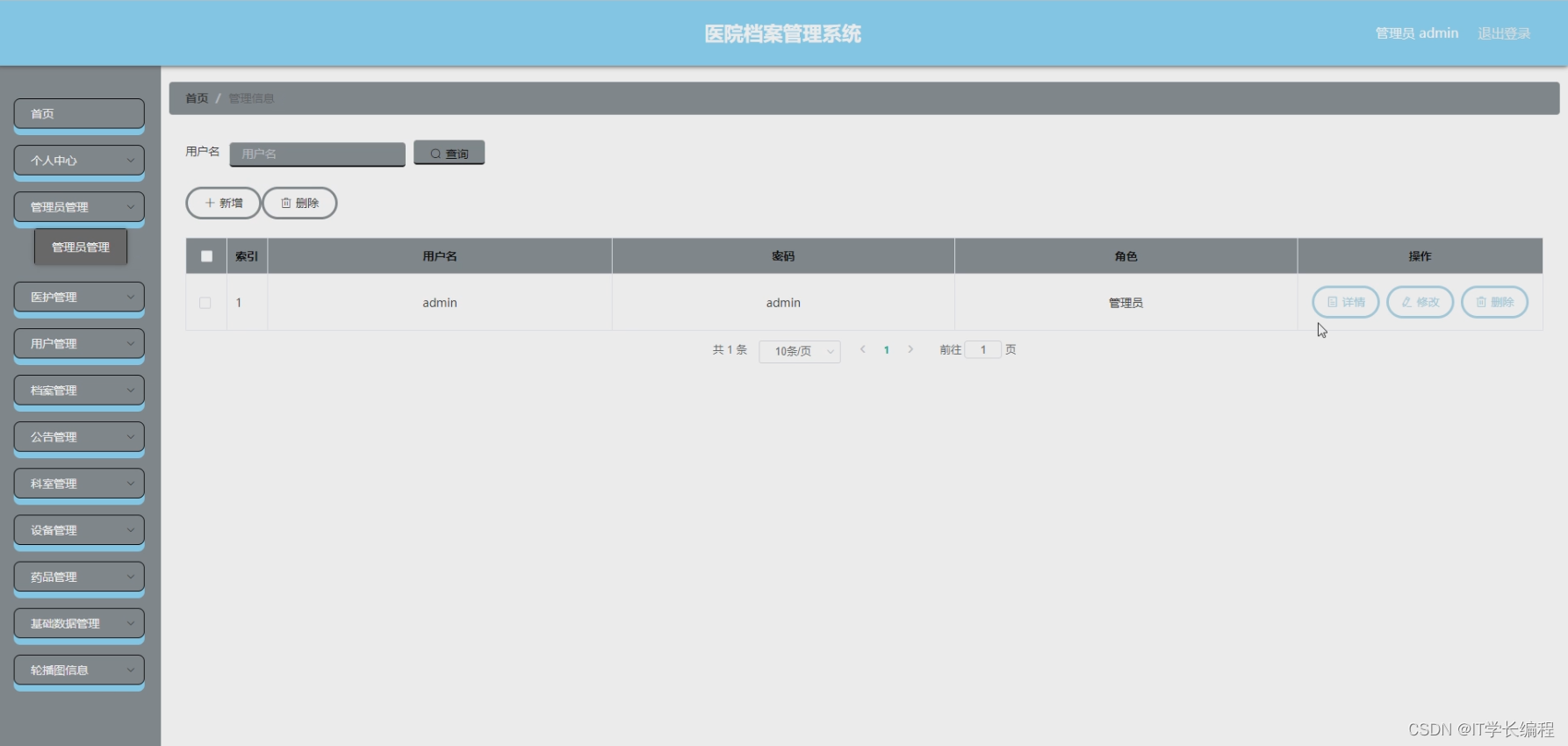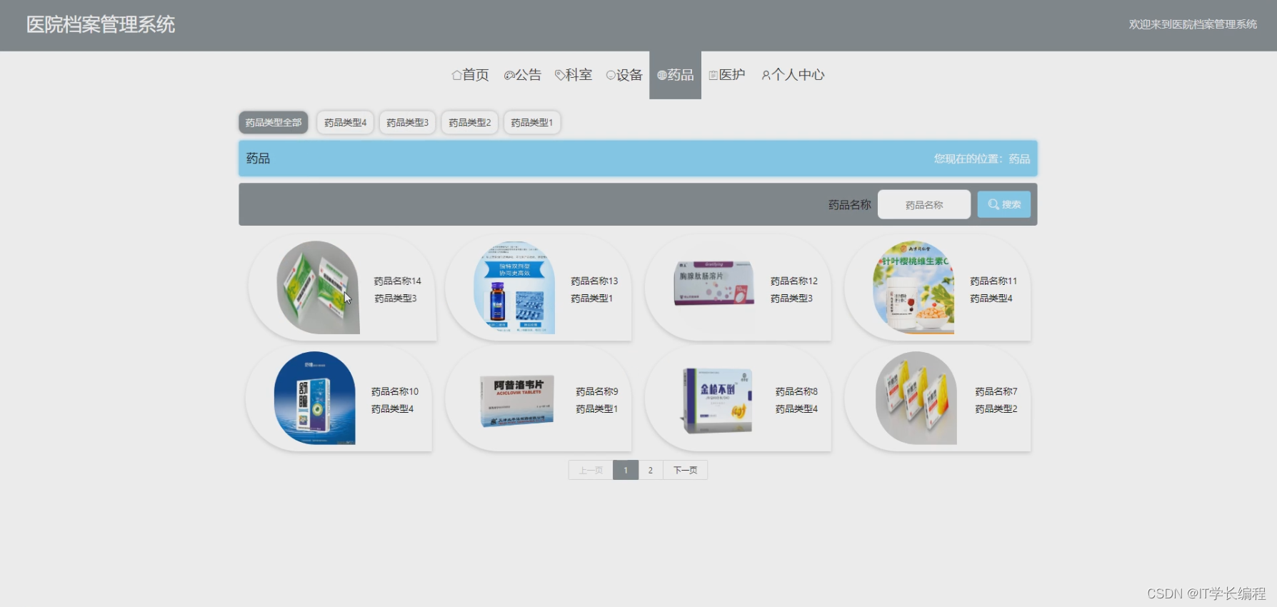 用户: 注册登录、首页、公告管理、科室管理、设备管理、药品管理、医护管理、个人中心(修改密码、个人信息)。