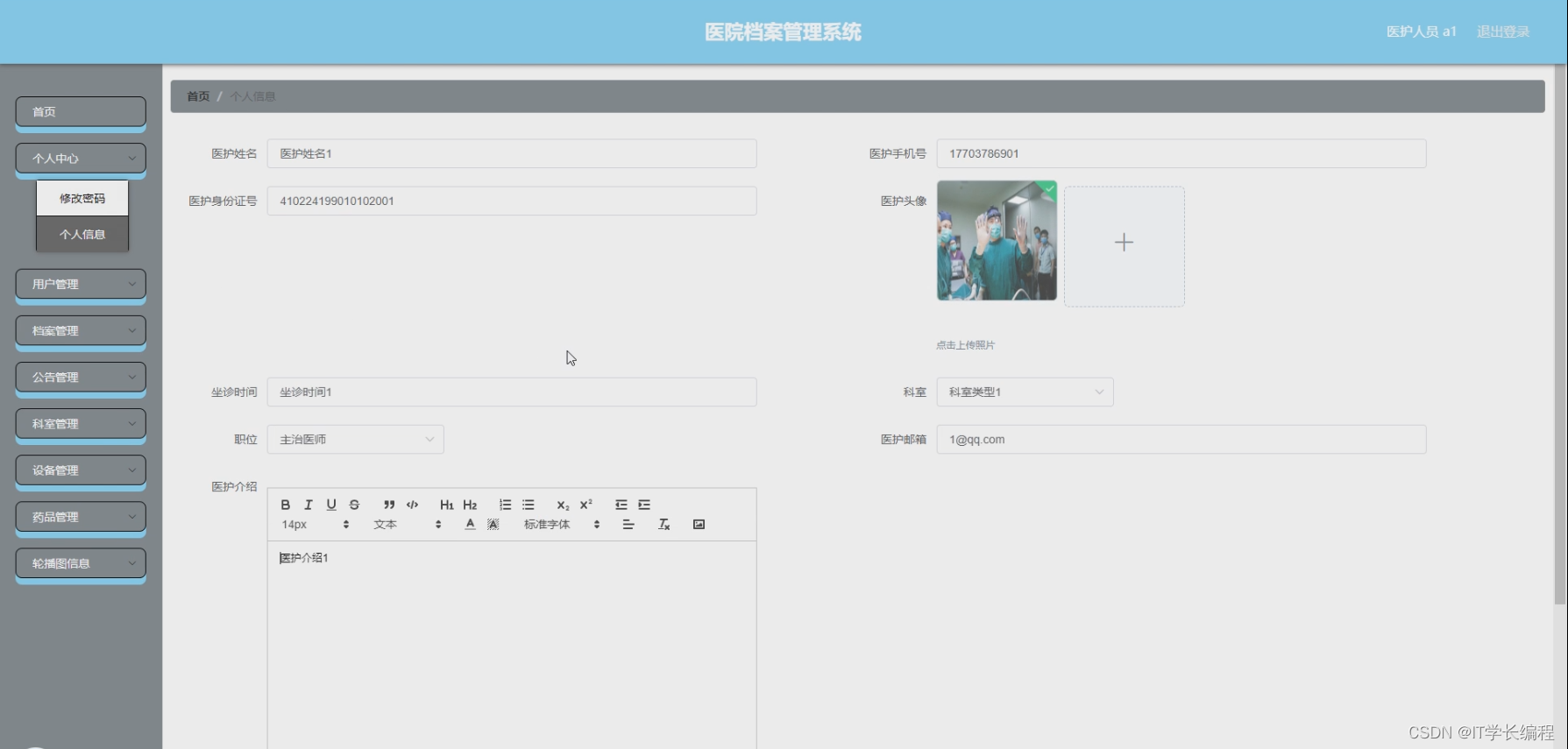 该系统的意义在于提高医院内部档案信息的管理效率和准确性。通过系统的建设和使用,医院可以更好地管理和利用内部的档案信息,提高工作效率和服务质量。同时,系统还具有良好的扩展性和可维护性,可以根据医院的实际需求进行功能的定制和调整。此外,系统还提供了个人中心功能,方便用户修改密码和更新个人信息,增加了系统的个性化和用户体验。无论是用户、医护人员还是管理员,都可以通过该系统实现对医院内部档案信息的全面管理和监控。该系统的开发背景是为了满足医院对档案信息管理的需求,采用了先进的技术和工具进行开发,具有重要的意义和应用价值。