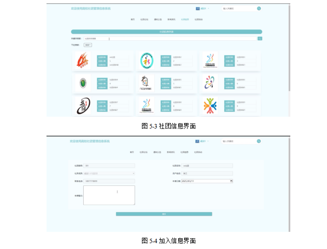 社团信息:用户点击可通过搜索社团名称进行查看社团信息列表,点击进入感兴趣的社团可查看详情信息,可进行点赞、收藏和评论。点击“加入”按钮可填写加入信息,包括申请日期和申请备注。界面如图5-3所示。