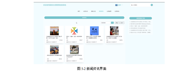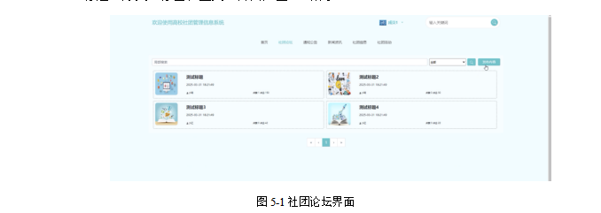 社团论坛:用户点击可查看交流论坛帖子列表,可对帖子进行查看、点赞、收藏和评论;同时可点击“发布内容”按钮填写论坛发布信息,包括封面图、标题、分类、标签和正文。界面如图5-1所示。