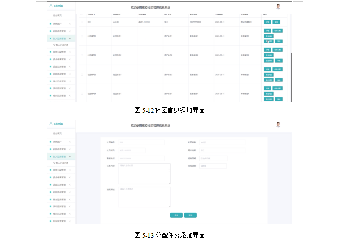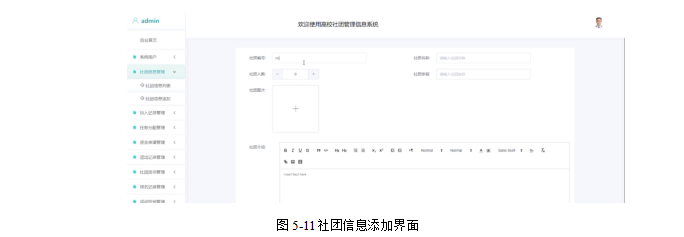 社团信息管理:管理员点击可查看社团信息列表和社团信息添加;点击进入“社团信息添加”可填写相关信息,包括社团编号、社团名称、社团人数、社团宗旨、社团图片和社团介绍。界面如下图所示。