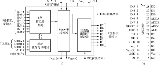 ADC0809内部由8路模拟量开关、8位A-D转换器和三态输出锁存缓冲器组成(如图5-52a所示),可以将由IN7~IN0输入的8路(通道)模拟量转成数字量并由D7~D0引脚输出。